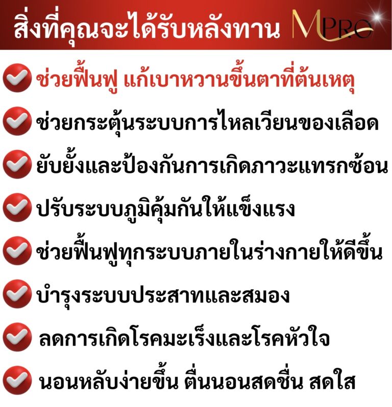 แต่พี่โชคดีที่เพื่อนของลูกชายแนะนำให้ทานสมุนไพรสกัดจากธรรมชาติที่ชื่อ MPro เพราะคุณแม่เขาก็มีอาการเหมือนพี่ แถมหนักกว่าพี่อีก ตอนเป็นถึงขั้นหัวใจเต้นผิดจังหวะ และต้องไปกายภาพบำบัดด้วยเครื่องสัปดาห์ละ 2-3 ครั้ง รักษากับหมอดังๆมาเยอะมาก แต่ก็ไม่หาย เขายังทานแล้วหายเป็นปกติ พี่เลยสั่งชุดโปร 2 แถม 1 มาลองทาน