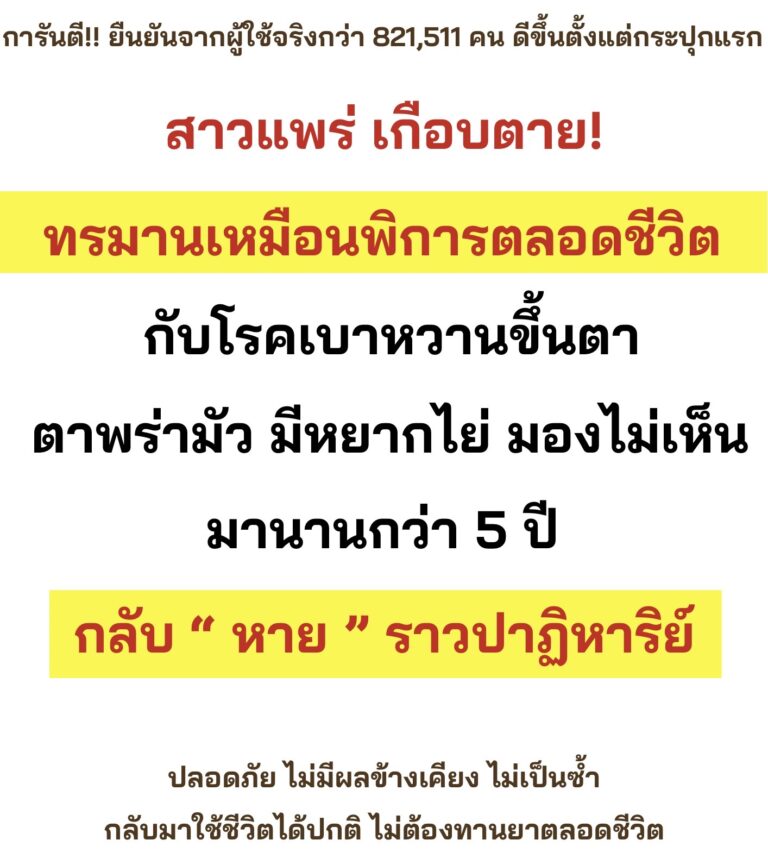 สวัสดีคะ ชื่อ แหม่ม น่ะคะ อายุ 51 ปี เป็นคนแพร่คะ วันนี้เราอยากจะมาแชร์ประสบการณ์ของตัวเอง เล่าย้อนกลับไปเมื่อ 5 ปีที่แล้วคะ พี่เคยป่วยเป็นโรคเบาหวานขึ้นตา แต่ตอนนี้หายเป็นปกติแล้ว พี่มีอาการ ปวดตาตลอด ตาบวม มองเห็นจุดสีดำ เส้นสีดำ ลอยไปลอยมา มองเห็นภาพซ้อน ภาพเบลอ ตาพร่ามัว มองเห็นม่านสีดำบังตา มีจุดเลือดออกในจอตา เห็นภาพบิดเบี้ยว มองเห็นภาพไม่สามารถแยกสีได้ ซื้อยามาทานก็ไม่ดีขึ้น